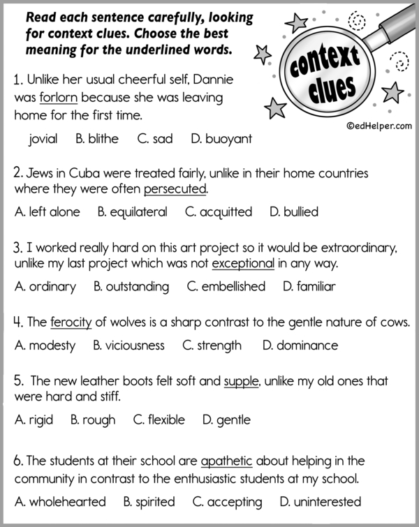 To accurately determine the meaning of specific words in this workbook, students must carefully read each sentence to identify context clues. Often embedded within the surrounding text, these clues provide vital hints about the meaning. After analyzing the context, students should select the most appropriate definition of the underlined word from a list of provided options.