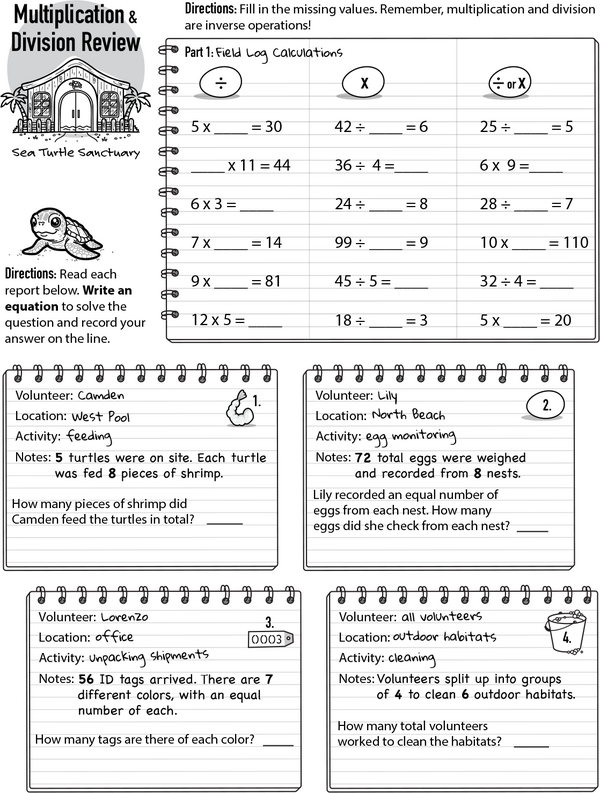 Welcome to Sea Turtle Sanctuary! Our field logs are in serious disarray. Can you use your multiplication and division skills to help straighten them out?