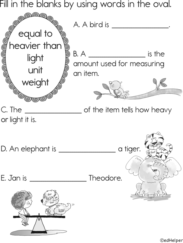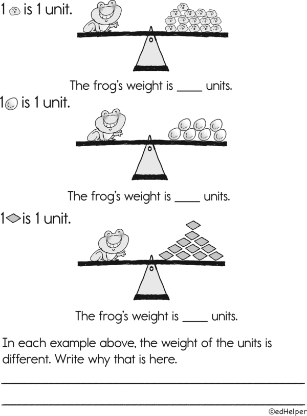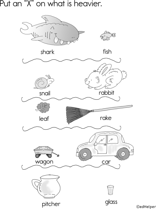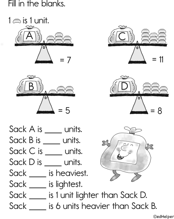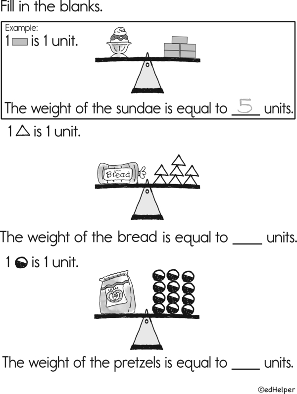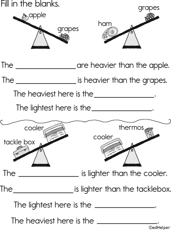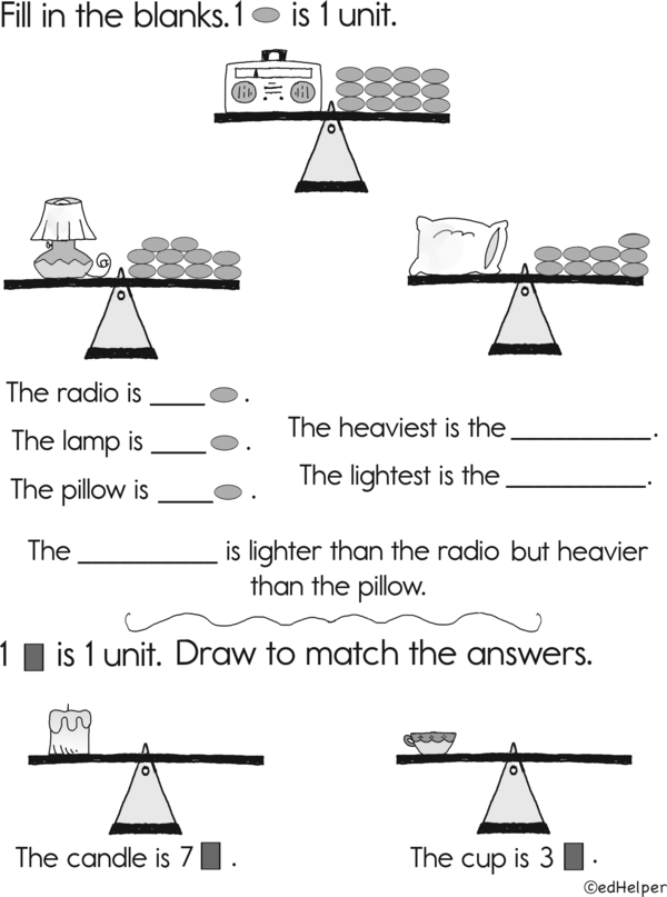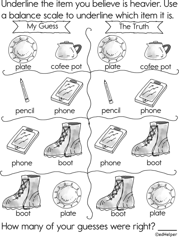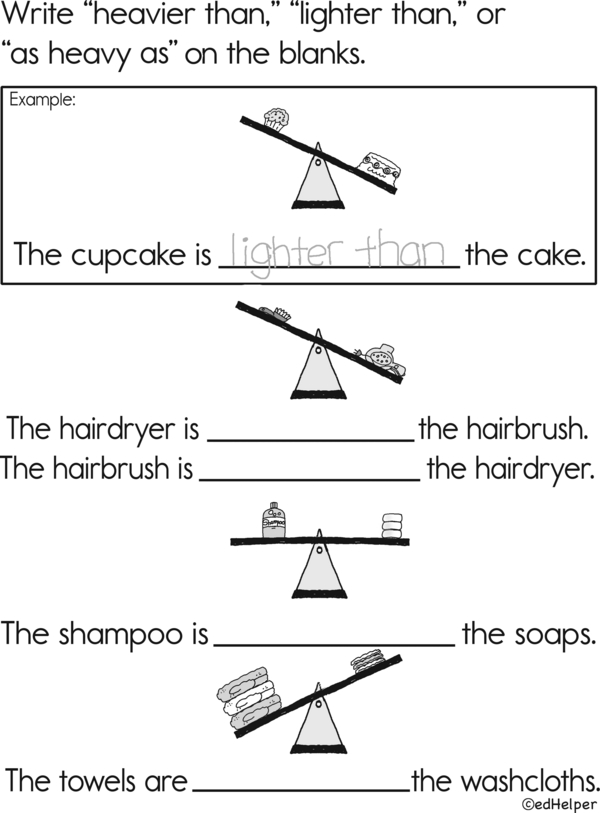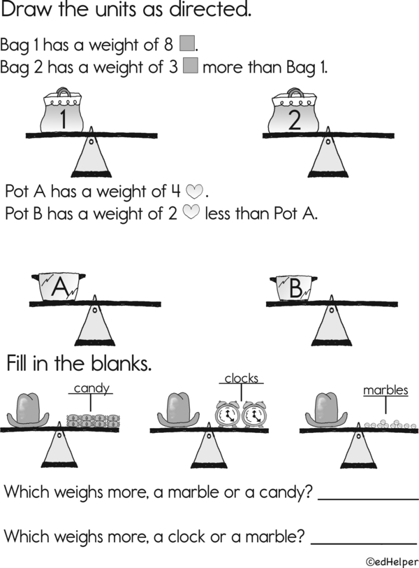 Ready for a weigh-in challenge? Great, let's begin! This workbook is packed with fun activities showing two items on each side of a balance scale. The heavier side tilts down, and the lighter side rises. If both weigh the same, the scale stays level. Understanding this is key to comparing weights and figuring out how heavy each item is. Now that you know the secret, grab a pencil and complete the challenge!