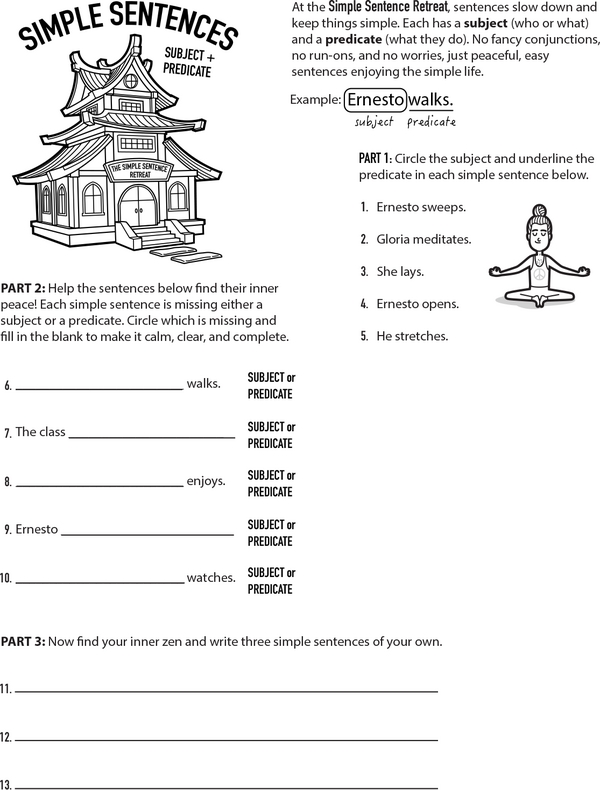 Breathe in. Breathe out. Welcome to the Simple Sentence Retreat! Here, every sentence has just two parts: a subject and a predicate. Follow the directions. Complete the activity.
