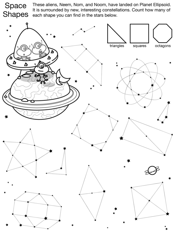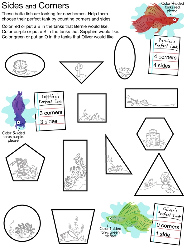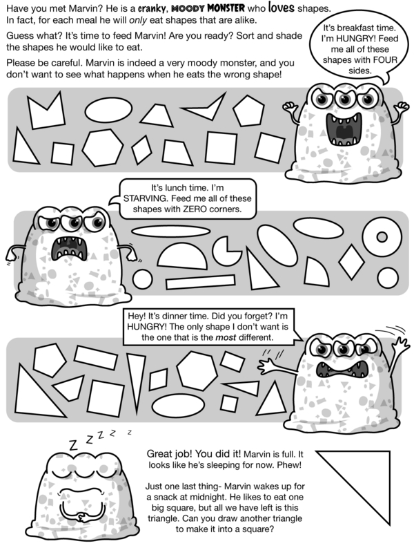 It's time for a shape-up! That's right, this workbook is all about shapes! Grab your pencil and crayons as you dive into the wonderful world of geometry. Along the way, you'll meet Moody Marvin, a monster who keeps coming back for more and different shapes! You'll help find homes for betta fish, count the shapes in the stars, and match the robot with its engineer. When you're done, you'll be an expert in shapes, patterns, sides, and corners!