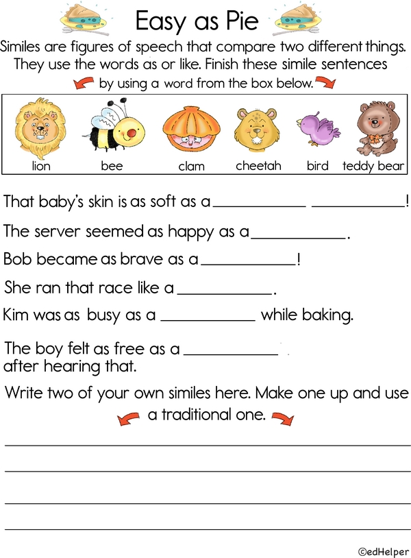 Similes compare two totally different things. The result? They help you imagine better and make your writing more interesting! Here are two examples: Jack runs fast like a cheetah. This blanket is as soft as a cloud. Now it's your turn. First, look at these picture words and use them to complete six sentences with similes. Then, write two more similes to add to the collection.
