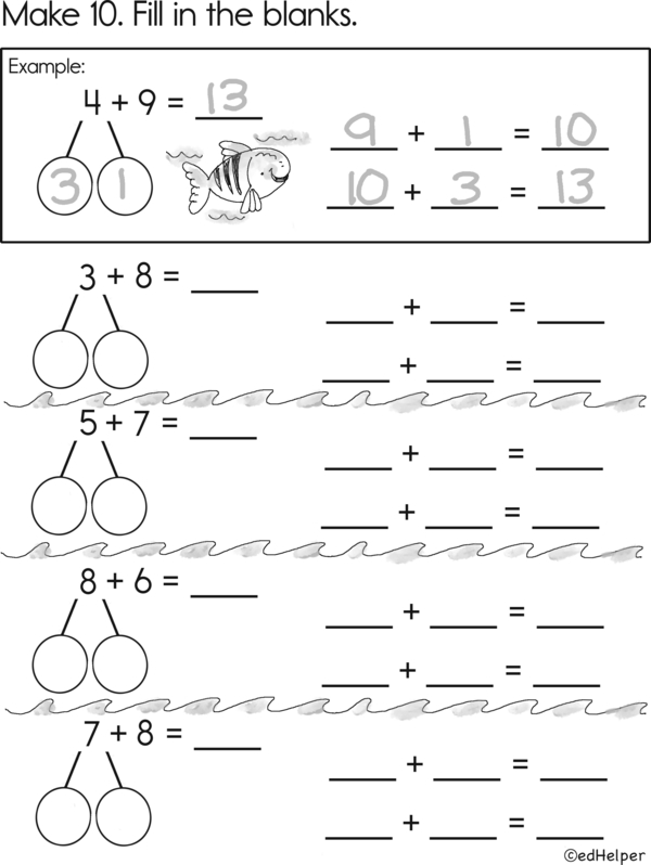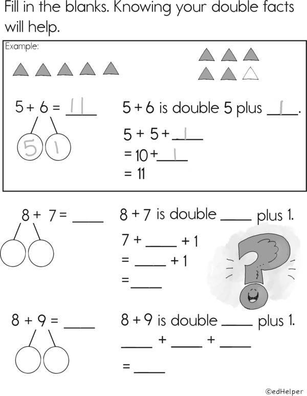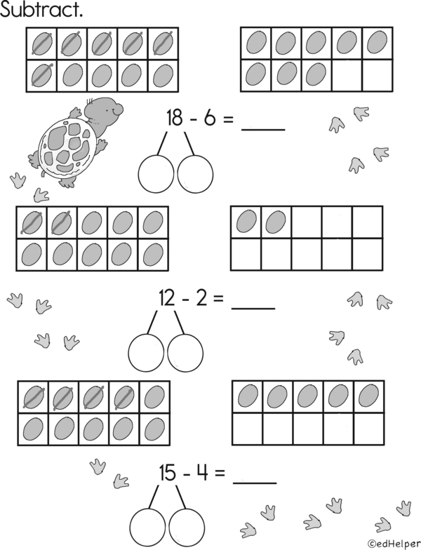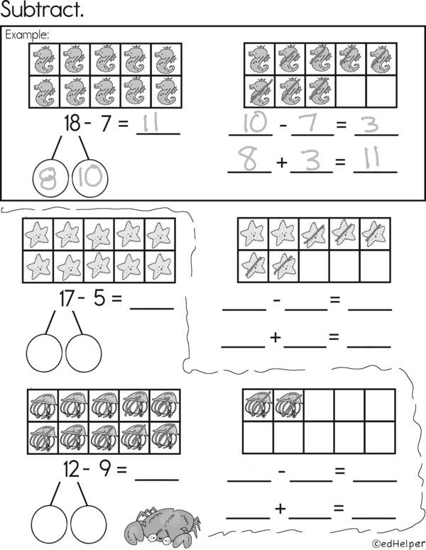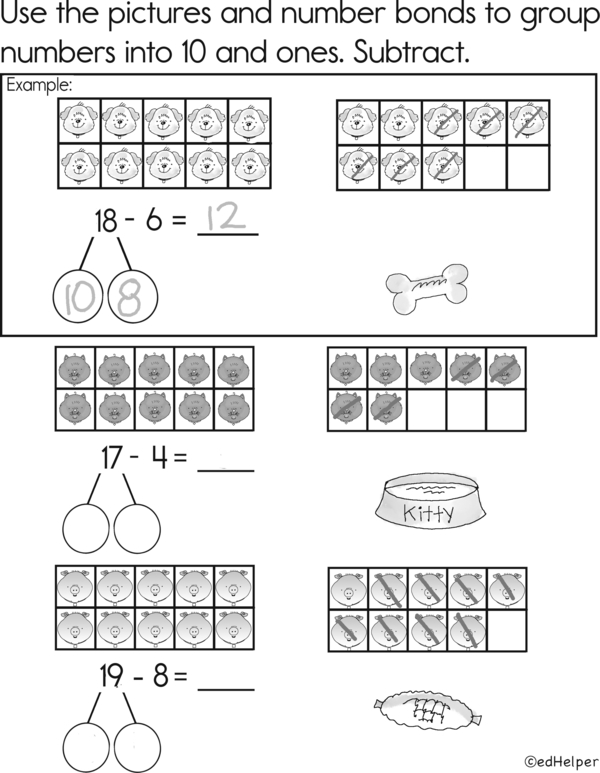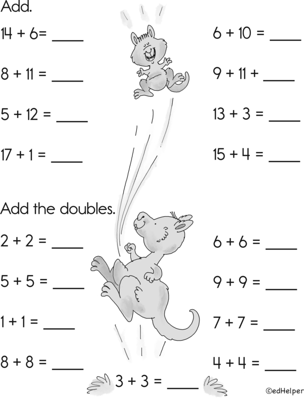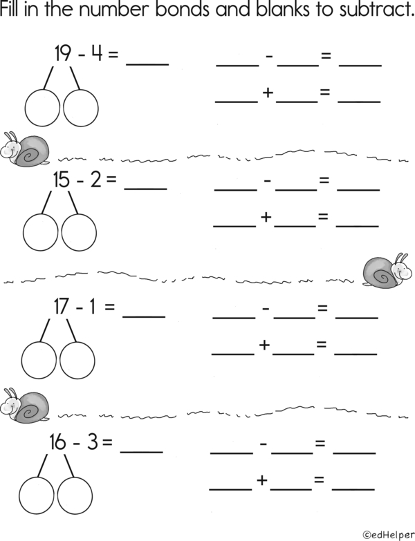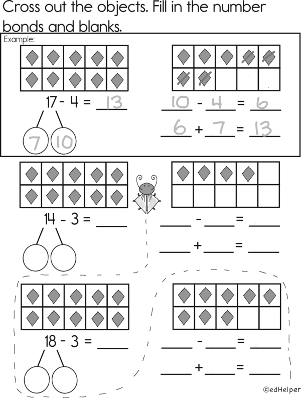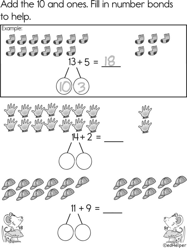 Let's explore addition and subtraction! Number bonds help you see how numbers fit together. For example, in 13 + 5, break 13 into 10 and 3. First, add the ones (3 + 5), then add the 10 to get 18. Here's another one: in 18 - 6, break 18 into 10 and 8. Subtract the ones (8 - 6), then add the 10 to get 12. A number bond turns a big number into two smaller ones. Once they are in bite-size pieces, adding and subtracting gets easier. Try it! As you work through the problems, keep an eye out for double facts. That is when the same number is added twice, like 5 + 5. Double facts are like shortcuts. They help you solve problems faster. Ready for the challenge? Grab your pencil, and let's go!