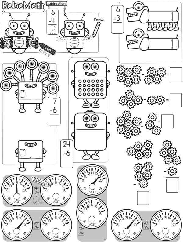 Ready for some math fun? Great! On page 1, look at all the hearts. Finish the pattern, count the valentines, and clear the maze. Don't forget to rhyme! Next, can you help fix the robots? They have too many parts. They use too much power. Subtract to solve the problems. Then, on pages 3 and 4, seven more puzzles await. Can you finish them?