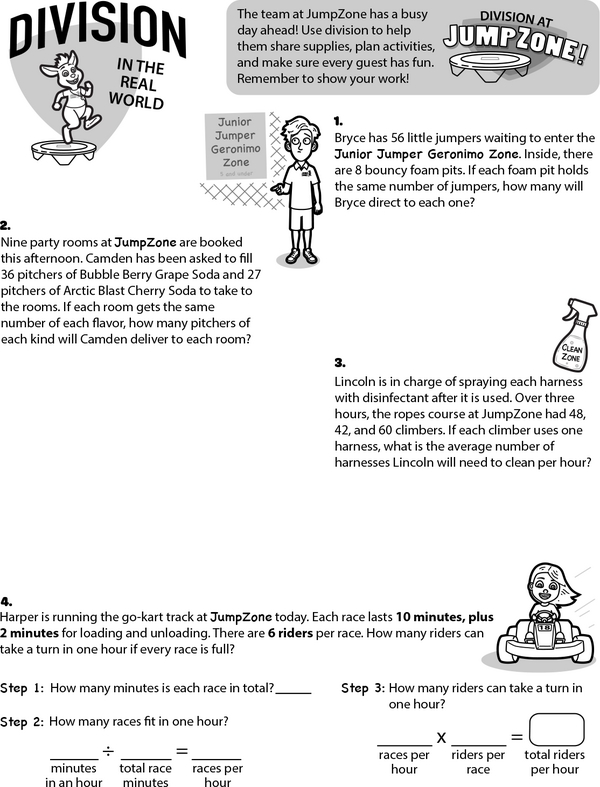 Ready to solve some division word problems? Come to JumpZone because the team needs your help! It's going to be a busy day. Your division skills hold the key to keeping everything running smoothly!
