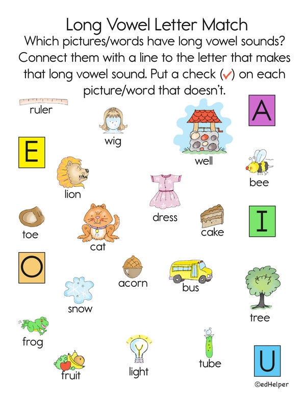 Welcome to the Long Vowel Challenge! Say each word. Does it have a long vowel sound? Draw a line to match it to the correct vowel. If a word doesn't have a long vowel sound, put a check on it. Ready, set, go!
