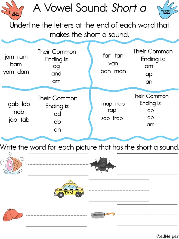 Ready for a quick phonics challenge? Check out these four groups of words, all with the short 'a' vowel sound. Notice how each group shares a common ending. Can you spot and underline it? Then, write the word for each picture that has the short 'a' sound.