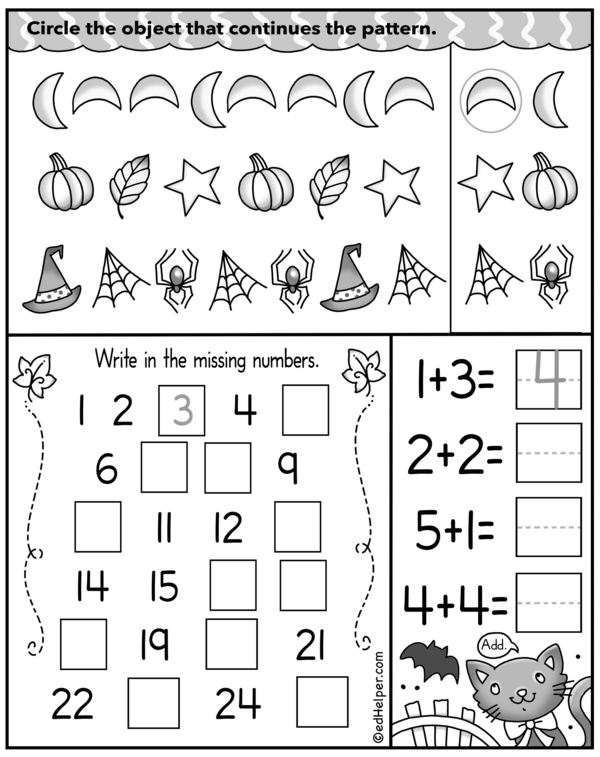 Ready for some fun Halloween puzzles? On page 1, add and subtract, then connect the dots. On page 2, spot the patterns, fill in the missing numbers, and solve three addition problems.