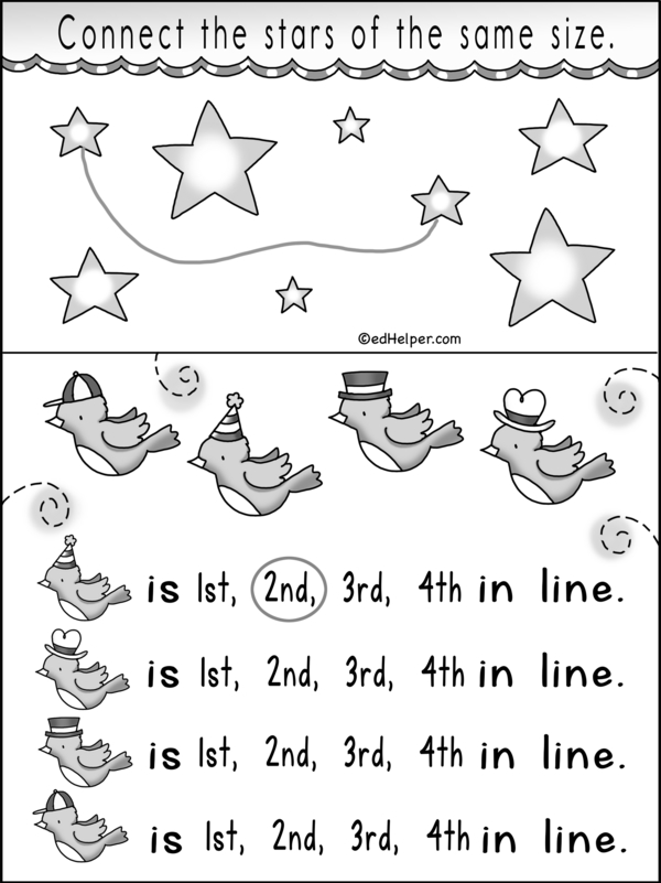 Ready for some fun activities? On page 1, spot the odd ones, then crack the codes of the honeybee's position to its hive. On page 2, look at all these stars! Pair up the ones with the same size. Before you go, what is each bird's position in the line? Circle your answers.