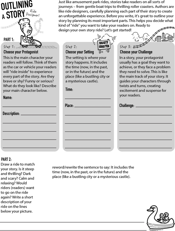 Got a story to tell? Let's start with an outline! Who is your main character? When and where does the story take place? What challenge does your character face? Jot down your ideas. Now, imagine your story as a ride in an amusement park. Draw the ride and explain why you chose it to represent your story. Have fun with this creative challenge!