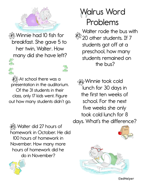 Winnie and Walter love to keep track of everything! They take careful notes on what they did and saw. Then, they turn these notes into word problems. Can you solve them all using subtraction?