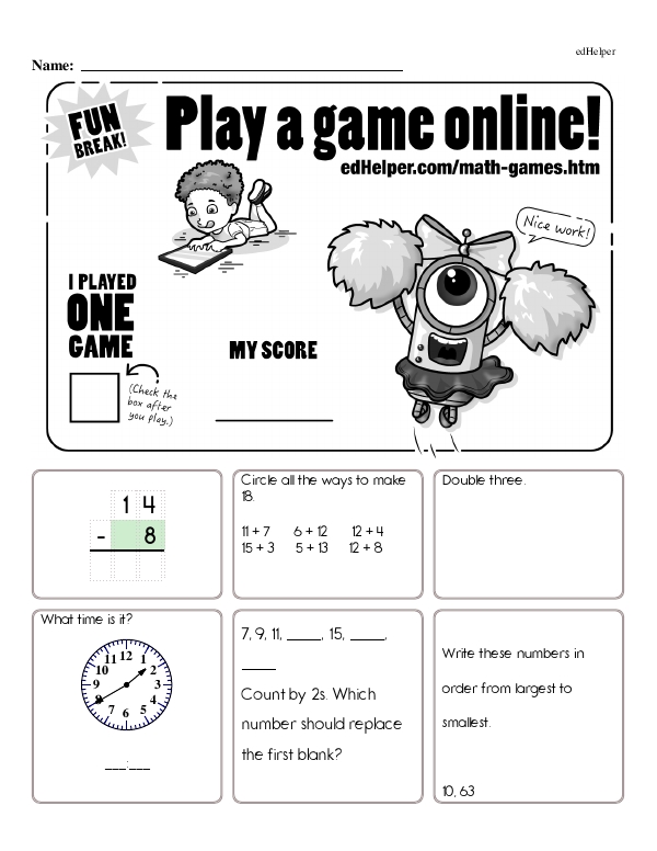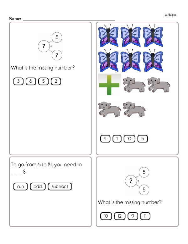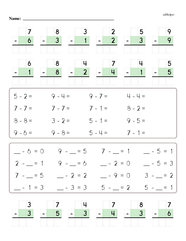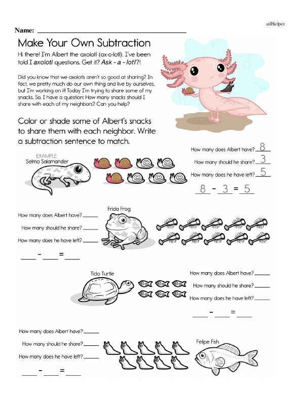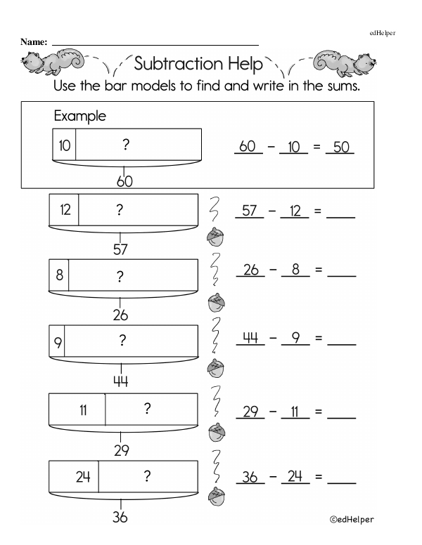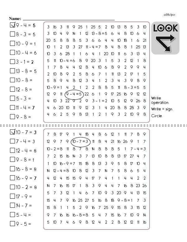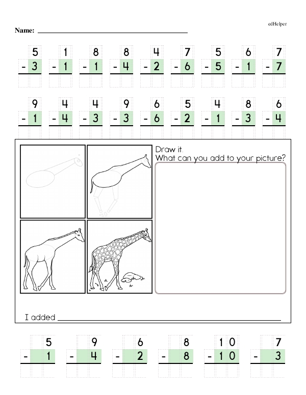 This math chapter workbook on "Subtraction Facts to 10" reviews basic subtraction language, such as "take away," "minus," and "difference." Students explore subtraction through visual aids, such as number lines, counters, and objects. This helps them grasp the concept of taking away items from a set. This workbook emphasizes the relationship between addition and subtraction to build a comprehensive understanding of inverse operations. Incorporating word problems further helps contextualize subtraction.