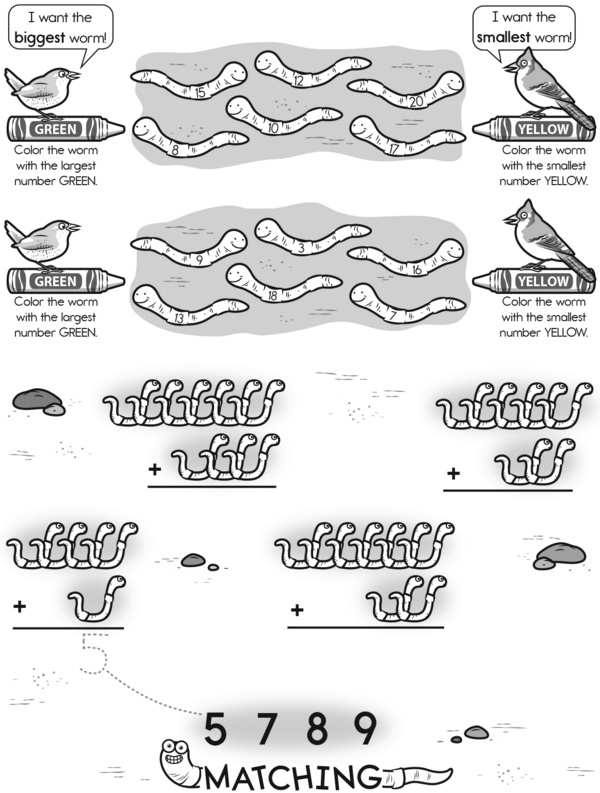 Let's play some matching games! On page 1, look closely and find the matching picture at the pool party. Remember to draw your favorite frozen treat! Then, help the birds find the worms with the correct numbers. Before you go, add the worms and match the numbers you see.