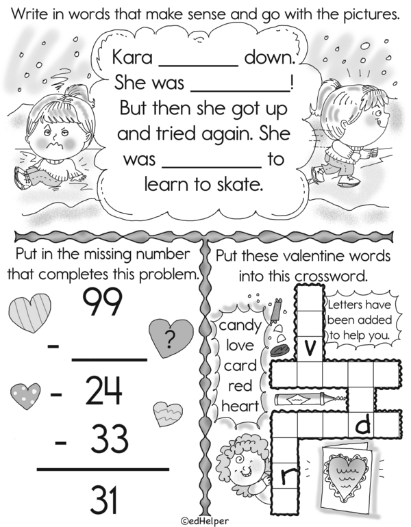 Let's solve some puzzles! On page 1, draw enough sweets to complete each number sentence. Then, can you tell which number is even and which is odd? Circle, underline, and color what you see. On page 2, fill in the missing words, solve a Valentine's Day math problem, and finish the crossword.