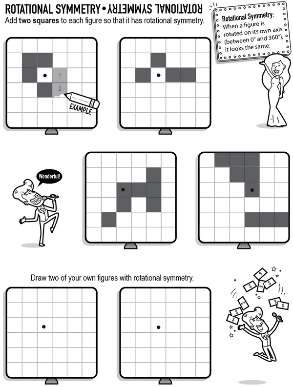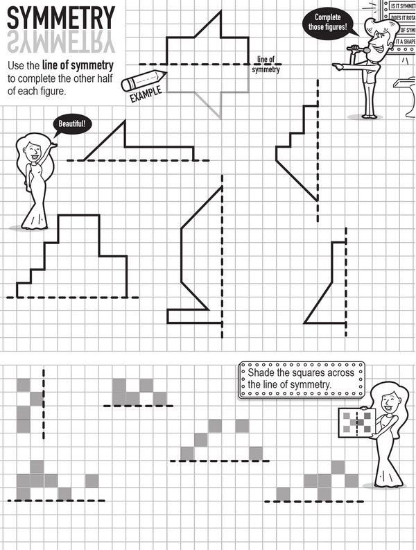 Let's play some fun symmetry games! First, check which sea creatures have a line of symmetry. Then, practice drawing lines of symmetry on different shapes and complete their mirror images. As you explore symmetry, see if you can find shapes with rotational symmetry. Enjoy the challenge!