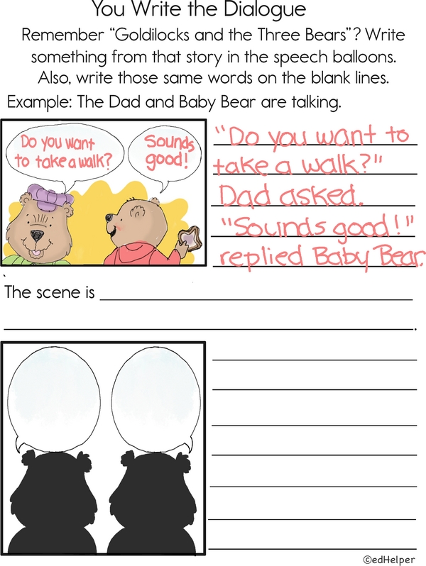 What are the bears saying? Think about 'Goldilocks and the Three Bears' to get ideas for a fun dialogue. First, write their words in the speech balloons, then write who says what on the blank lines. That way, you get to practice using quotation marks and punctuation, too!