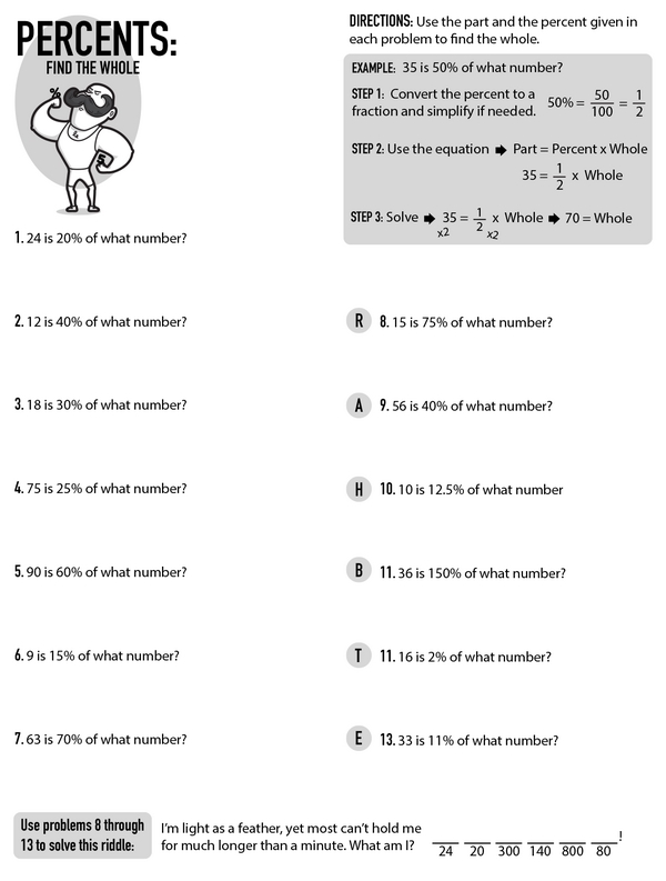 Inspector Whole needs answers! In each problem, he sees a percentage and a part, but he doesn't know the whole. Study the example closely, then solve them all!