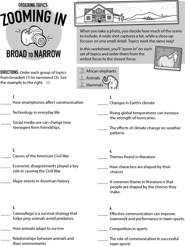 Check out these six topic groups. Each group has three related topics. Read them carefully, and then label them from broadest (1) to narrowest (3). It's a lot like zooming in with a camera. Why is this important? Learning to spot big ideas and smaller details helps you understand information and become a sharper thinker!