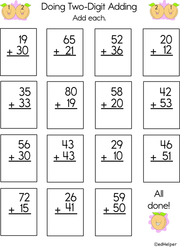 Let's add! This worksheet has fifteen two-digit addition problems. Remember, if a sum is more than 9, carry the extra to the next place. Now grab your pencil and solve them all!