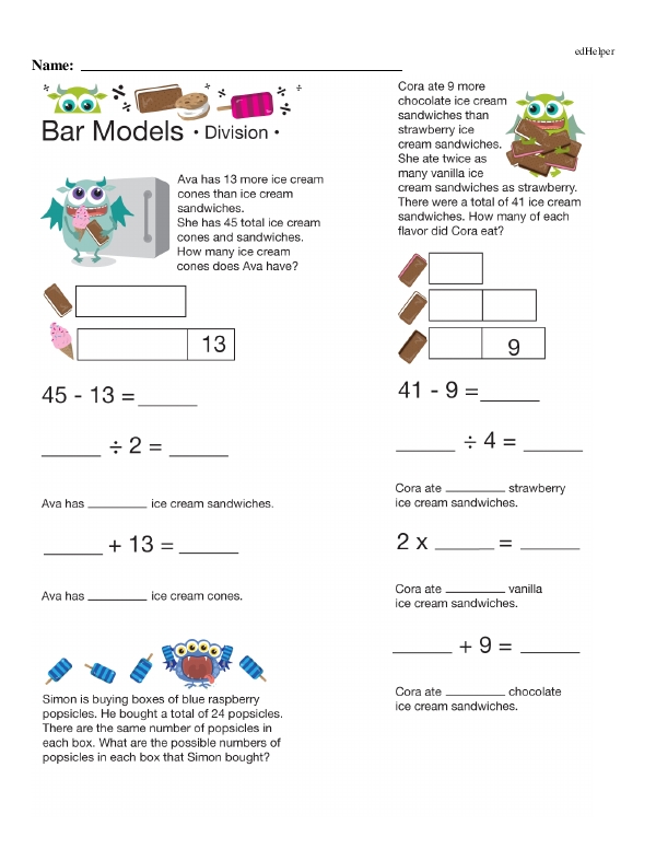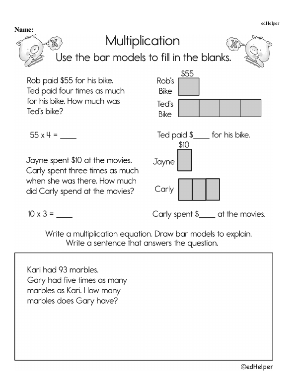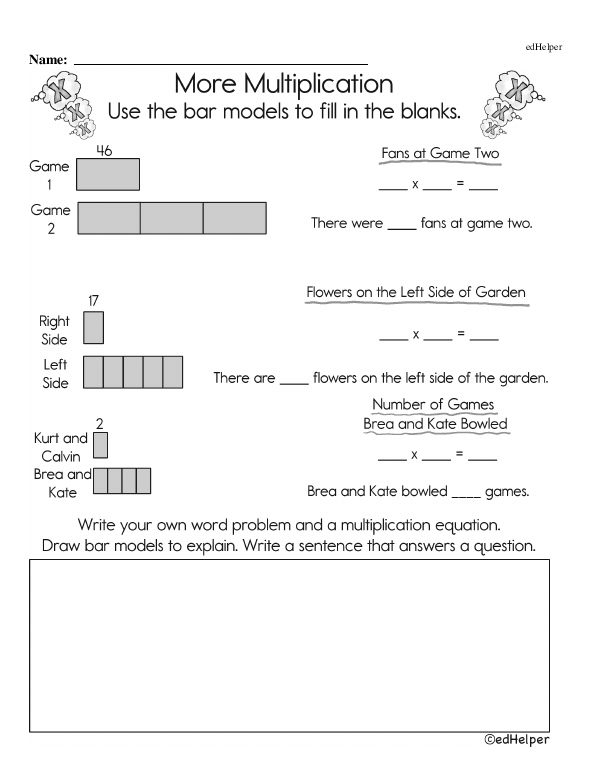 The workbook "Using a Bar Model: Multiplication and Division" continues practice with using bar models as a visual tool to represent and solve multiplication and division problems. Students learn how to draw and interpret bar models to represent multiplication scenarios, such as using repeated addition and arrays, and how these models can be partitioned to show division as both sharing and grouping.