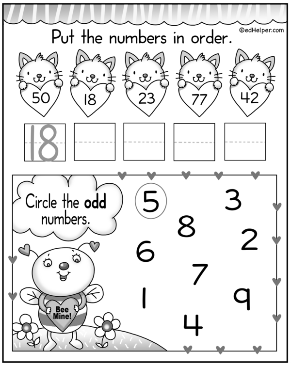 Roses are red. Violets are blue. Valentine's Day is near. Let's shower numbers with love. First, count, add, and put numbers in order. Then, from one to nine, circle the odd ones to show your smarts!