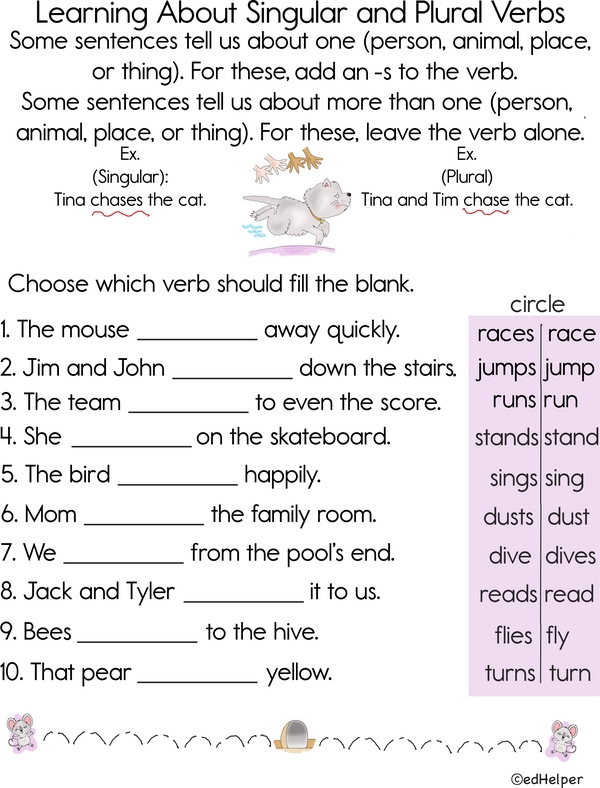 Subjects and verbs always go together! In the present tense, if the subject is one person, place, or thing, the sentence needs a singular verb. Usually, you add -s at the end, but some verbs have exceptions. If the subject is more than one, the sentence needs a plural verb, which does not need any extra endings. Now, read each sentence carefully. Check the subject and choose the correct verb to fill the blank.