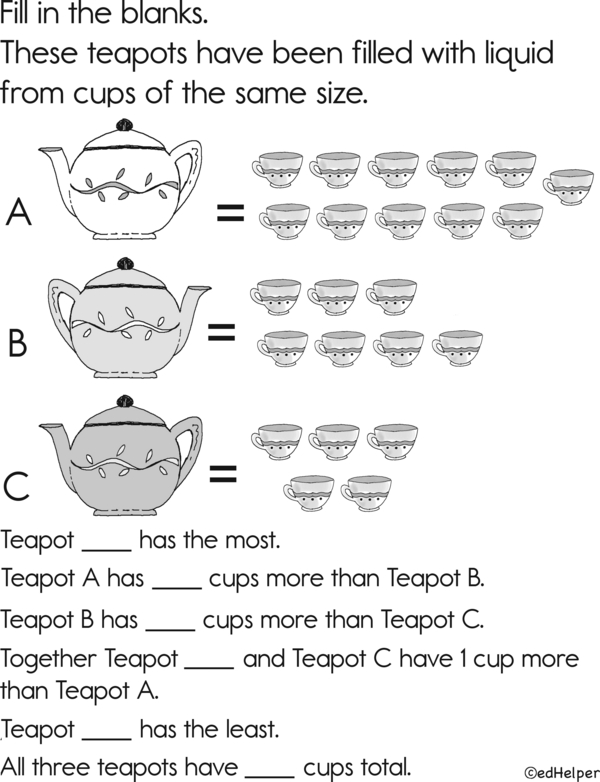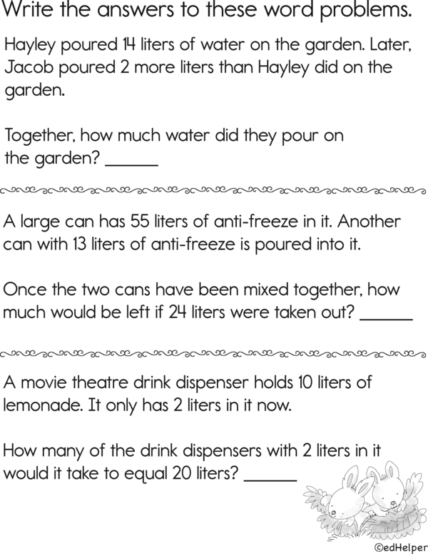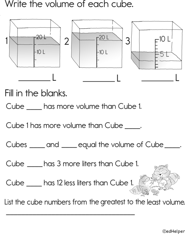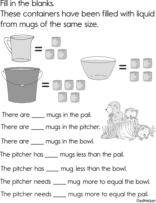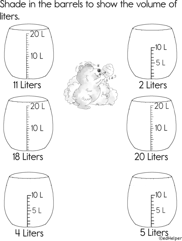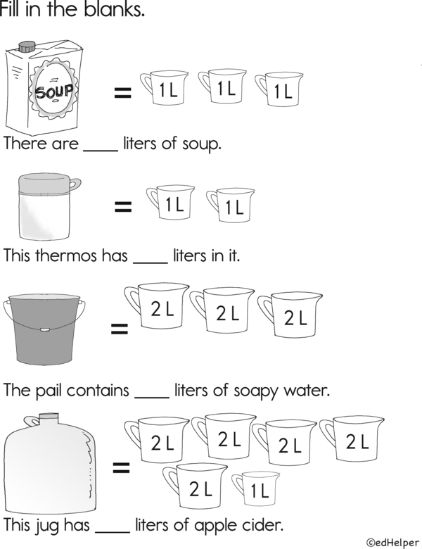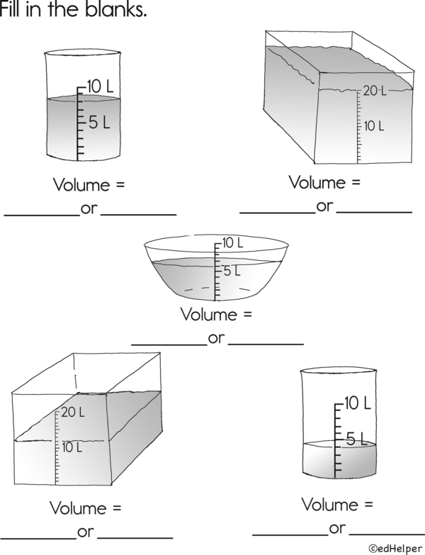 This workbook speaks volumes! Look at all these containers with liquid in them. Which one has the most? Which one has the least? Do any two have the same? Can you read the scale markings and write your answers? All done? Great! Now, you speak volumes!