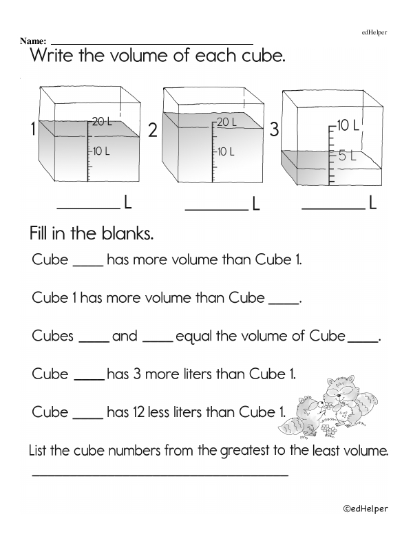 This math chapter workbook on "Volume," uses everyday objects such as cubes, rectangular prisms, and other simple containers to visually demonstrate how volume can be compared and measured. Students will solve problems such as comparing the volumes of different containers or finding out how much liquid can fill a container. For instance, a problem might ask which of two cups holds more water.