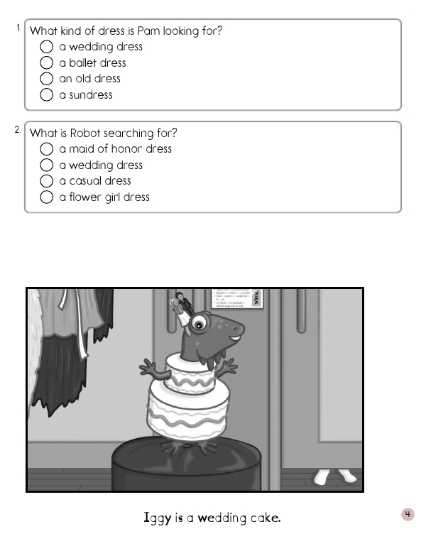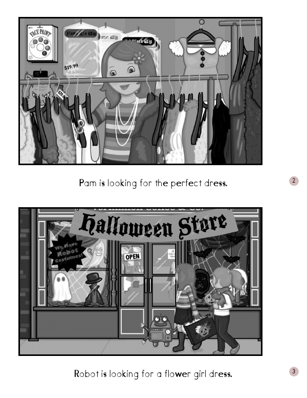The story consists of 14 short sentences with a total word count of 84 words. Some of the difficult words for early readers could be "parade," "treat," "perfect," and "Dorothy." The story layers different scenarios and characters, which may be tricky for children to understand or remember all at once. Teachers should emphasize the various roles of characters such as Pam, Robot, etc., and different scenarios like school parade, trick or treat, wedding cake, etc.