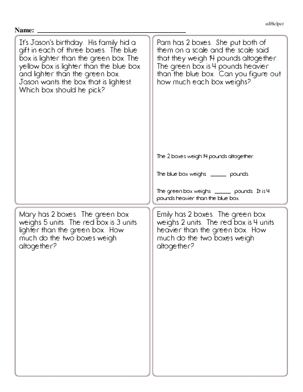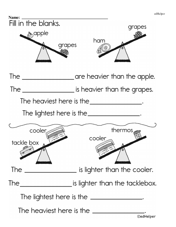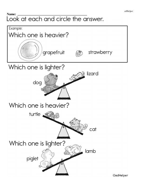 This math chapter workbook on "Weight" covers fundamental concepts that help students understand and compare the weight of different objects. The curriculum begins with an introduction to weight, explaining how "heavy" or "light" an object feels. Vocabulary such as "heavier," "lighter," "balance," and "weight" is emphasized throughout the lessons to build students' mathematical language skills. Students might compare two items, such as an apple and a pencil, and a circle, which is heavier. Another problem could involve arranging three objects (e.g., a feather, a book, and a toy car) from lightest to heaviest. To foster understanding, students can be encouraged to use a balance scale for tactile learning, reinforcing that when one side tilts lower, the object on that side is heavier.