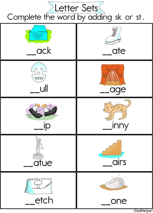 Look at these 10 picture words. Their first letters are missing! Use the pictures as clues, then fill in the blanks with sk or st.