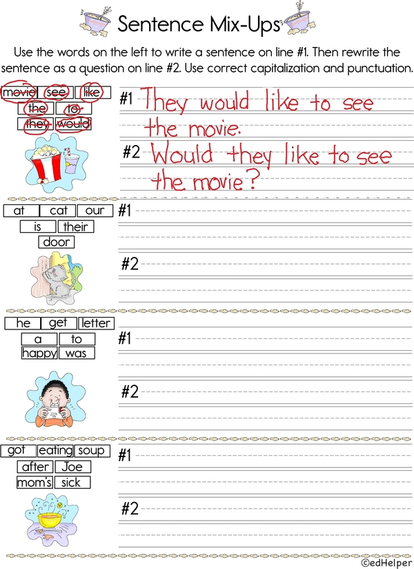 Let's make sentences! Look at the words above each picture. Use them to write two sentences: first a statement, then a question. Ready, set, go!